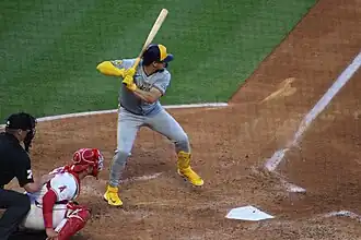 On September 2, 2024, Adames tied the major league shortstop record for hitting a home run in five consecutive games. Adames shares the record with Eddie Miller (1940), Alex Rodriguez (1999 and 2003), Corey Seager (2022), Trea Turner (2023) and Tyler Fitzgerald (2024).[32][33] Adames ended the year with a 4.7 wins above replacement, making him one of the 20 most valuable players in the league by that metric in the 2024 season. He started all but one of the Brewers' regular season games, had a slash line of .251/.331/.462, and hit 18% better than the average major league player (OPS+).[34]