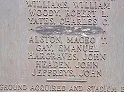 The stadium has a pair of bronze plaques framing the archway and listing the area's war dead during 1917–1919. Close examination of the right-side plaque reveals that there were actually two alphabetical lists. Some sources say that this was a separation of white from "colored" in the conventional practice of the segregation era. The marker between the two lists was later roughly chiseled away.