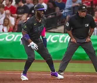 Díaz was named to his first All-Star Game in 2023, when he was elected the American League starter at first base. In his first at-bat, he hit a solo home run to put the AL up 1-0, becoming the first Rays starter to homer in an All-Star Game and the first Cuban-born player to do so since Cookie Rojas in 1972.[13] Diaz and his wife welcomed their first son the day after the All-Star Game. Diaz therefore flew into Seattle the morning of the All-Star Game, and flew back immediately afterward. He was officially placed on the paternity list on July 14.[14] Díaz led the AL in batting average (beating out Corey Seager on the last day of the season) and in batting average on balls in play (.367), as he hit .330/.410/.522 with 22 home runs and 78 runs batted in.[15] In doing so, he became the third Cuban-born player to win a batting title, after Tony Oliva and Yuli Gurriel. Díaz finished 6th in AL MVP voting and also won the 2023 Silver Slugger Award for AL first basemen.[16]