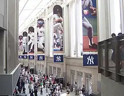 Between the exterior perimeter wall and interior of the stadium is the "Great Hall", a large open air concourse that runs between Gates 4 and 6.[46] With seven-story ceilings, the Great Hall is the largest open air public entry way at any sports venue in the world and features more than 31,000 square feet (2,900 m2) of retail space and is lined with 20 banners of past and present Yankees superstars.[46][47] The Great Hall features a 5-by-383-foot (1.5 by 116.7 m) LED (light-emitting diode) ribbon display as well as a 25' by 36' LED video display above the entrance to the ballpark from Daktronics, a company in Brookings, South Dakota.[46][48]