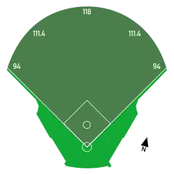 | Field size | Left/right field – 94 m (308.4 ft) Left/right-center – 111.4 m (366 ft) Center Field – 118 m (387.1 ft) Height of Outfield Fence – 5 m (16.4 ft) ![]() |