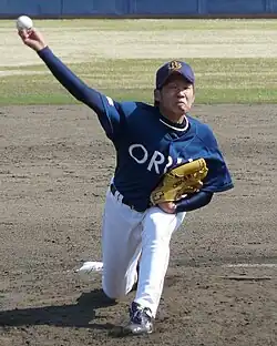 After pitching well in the pre-season exhibition games, he became part of the main squad starting rotation. He got his first start on April 17 against Softbank in Koshien, and recorded his first career win after pitching 7 innings and surrendering only 3 hits and a single run.[3] He went on a roll and pitched undefeated in his next 3 outings, securing his 4th win by May 8 against the Marines.[4] His winning streak ended there however, and he didn't manage another win until June 4.[5] He caught the flu the day before his next outing, and assigning the newly acquired pitcher Evan MacLane as his replacement put an end to Orix's seven-game winning streak. He was severely scolded for not taking better care of himself, and was removed from the roster by team manager Akinobu Okada as punishment.[6] He was called back on July 1 and pitched 3 innings in relief to record his first career save.[7] He then alternated as a starter and reliever in the following weeks, and on August 11, he pitched his first complete game while giving up only a single run.[8] But after acquiring 2 consecutive losses within 3 days in October, he was again removed from the roster. Two weeks later, he earned his last win in his final outing, and finished the season with 10-7 and a 3.03 ERA from 25 games.