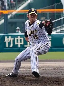 He was Hanshin's best pitcher in his first year with the club, winning 10 games with a 2.92 ERA (fifth-best in the Central League) and 1.13 WHIP in 172⅓ innings.[26] While he did not record the win in his first outing, he pitched a complete game in his next start against the Carps to notch his first complete win in 2 years.[27] He continued to pitch well and reached the 1,000 strike-out milestone on June 21, becoming the 149th NPB pitcher to do so.[28] When the Tigers were fighting a tight battle with the Carps for 3rd towards the end of the season, he brought his A-game and won all of his 4 starts in September (1.93 ERA) which not only earned him the MVP of the month award (first since 2014), it also proved instrumental to the Tigers' narrow advance in the final rankings.[29] He also topped the league in Quality Start Percentage with 73.08% (19 out of 26 starts), and earned his first ever Pitcher Golden Glove award.[30]