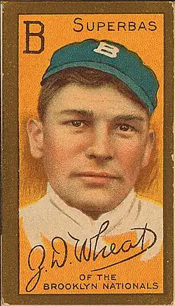 Wheat began his professional baseball career in 1906 for Enterprise in the Kansas League, followed by Wichita in 1907, the Shreveport Pirates of the Texas League in 1908, and the Mobile Sea Gulls of the Southern Association in 1909.[6] It was during that 1909 season that the Brooklyn Superbas of the National League purchased Wheat for $1,200,[6] and he made his major league debut in September.[4] Wheat batted with a corkscrew type of swing, and held his hands down near the end of the bat, unlike most hitters during his time, a time noted as the "Dead Ball Era". Along with his consistently high levels of hitting, he was also noted for his graceful and stylish defense.[7]