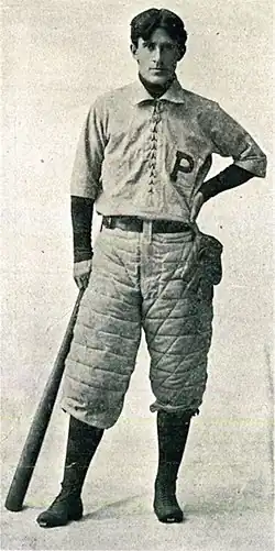 Grey chose the University of Pennsylvania on a baseball scholarship; he studied dentistry, joined Sigma Nu fraternity, and graduated in 1896. When he arrived at Penn, he had to prove himself worthy of a scholarship before receiving it. He rose to the occasion by coming in to pitch against the Riverton club, pitching five scoreless innings and producing a double in the tenth, which contributed to the win.[14] The Ivy League was highly competitive and an excellent training ground for future pro baseball players. Grey was a solid hitter and an excellent pitcher who relied on a sharply dropping curveball. When the distance from the pitcher's mound to the plate was lengthened by five feet to 60 feet 6 inches, in 1894 (primarily to reduce the dominance of Cy Young's pitching), the effectiveness of Grey's pitching suffered. He was re-positioned to the outfield.[15] The short, wiry baseball player remained a campus hero on the strength of his timely hitting.[16]