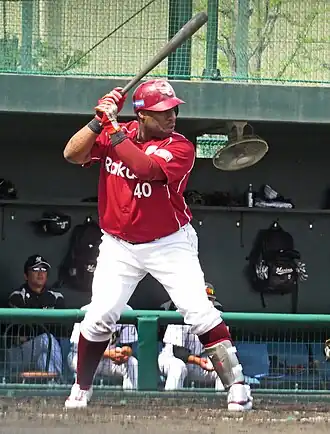On November 20, 2014, the Yankees sold Wheeler to the Tohoku Rakuten Golden Eagles of Nippon Professional Baseball's Pacific League.[33][34] In 2015, Wheeler slashed .255/.339/.453 with 14 home runs and 50 RBI for the team. The next year, Wheeler improved his performance, slashing .265/.351/.478 with a staggering 27 home runs and 88 RBI. In 2017, Wheeler batted .271/.343/.493 with 31 home runs and 82 RBI. Wheeler signed a two-year contract extension worth ¥400 million (approximately $3.5 million) in October 2017, the deal includes incentives and a club option for the 2020 season.[35] In 2018, Wheeler hit .269/.337/.432 with 15 home runs and 58 RBI in 106 games. In 117 games for the Eagles in 2019, Wheeler batted .243/.320/.418 with 19 home runs and 67 RBI. On December 3, 2019, Wheeler signed a 1-year extension to remain with the Eagles.[36]