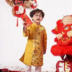 The predecessor of the áo dài was derived by the Nguyễn lords in Phú Xuân during 18th century.[9] This outfit was derived from the áo ngũ thân, a five-piece shirt commonly worn in the 19th and early 20th centuries. The áo dài was later made to be form-fitting which was influenced by the French, Nguyễn Cát Tường and other Hanoi artists redesigned the áo dài as a modern shirt in the 1920s and 1930s.[10] The updated look was promoted by the artists and magazines of Tự Lực văn đoàn (Self-Reliant Literary Group) as a national costume for the modern era. In the 1950s, Saigon designers tightened the fit to produce the version worn by Vietnamese women.[10] The áo dài for women was extremely popular in South Vietnam in the 1960s and early 1970s. On Tết and other occasions, Vietnamese men may wear an áo gấm (brocade long shirt), a version of the áo dài made of very thick fabric and with sewed symbols.