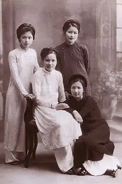 Huế's Đồng Khánh Girls' High School, which opened in 1917, was widely praised for the áo dài uniform worn by its students.[18] The first modernized áo dài appeared at a Paris fashion show in 1921. In 1930, Hanoi artist Cát Tường, also known as Le Mur, designed a shirt inspired by the áo ngũ thân and by Paris fashions. It reached to the floor and fit the curves of the body by using darts and a nipped-in waist.[19] When fabric became inexpensive, the rationale for multiple layers and thick flaps disappeared. Modern textile manufacture allows for wider panels, eliminating the need to sew narrow panels together. The áo dài Le Mur, or "trendy" ao dai, created a sensation when model Nguyễn Thị Hậu wore it for a feature published by the newspaper Today in January 1935.[20] The style was promoted by the artists of Tự Lực văn đoàn ("Self-Reliant Literary Group") as a national costume for the modern era. The painter Lê Phô introduced several popular styles of ao dai beginning in 1934. Such Westernized garments temporarily disappeared during World War II (1939–45).