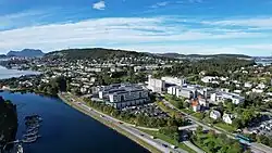 In Norwegian, Ålesund is considered to be a by which can be translated as a town or a city.[1] Ålesund is the ninth largest town/city in Norway.[5] The town has become more of an urban agglomeration during the late part of the 20th century and the urban area has spread out and into the neighboring Sula Municipality. The 28.93-square-kilometre (7,150-acre) town has a population (2024) of 55,684 and a population density of 1,925 inhabitants per square kilometre (4,990/sq mi). About 21.75 square kilometres (8.40 sq mi) of the town with a population of 46,554 lies in Ålesund Municipality and the remaining 7.19 square kilometres (2.78 sq mi) of the town with a population of 9,130 lies in Sula Municipality.[2]