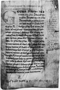 Some time after the arrival of Augustine's mission, perhaps in 602 or 603, Æthelberht issued a set of laws, in ninety sections.[44][45] These laws are by far the earliest surviving code composed in any of the Germanic countries,[23] and they were almost certainly among the first documents written down in Anglo-Saxon, as literacy would have arrived in England with Augustine's mission.[46] The only surviving early manuscript, the Textus Roffensis, dates from the twelfth century, and it now resides in the Medway Studies Centre in Strood, Kent.[47] Æthelberht's code makes reference to the church in the very first item, which enumerates the compensation required for the property of a bishop, a deacon, a priest, and so on;[45] but overall, the laws seem remarkably uninfluenced by Christian principles. Bede asserted that they were composed "after the Roman manner", but there is little discernible Roman influence either. In subject matter, the laws have been compared to the Lex Salica of the Franks, but it is not thought that Æthelberht based his new code on any specific previous model.[23][44]