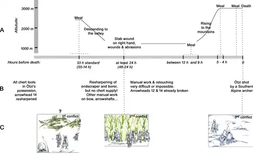 Reconstructions of Ötzi's last days, based on his last itinerary and meals, the state of his wounds, the causes of his death and the damaged and insufficient equipment, following multiple studies