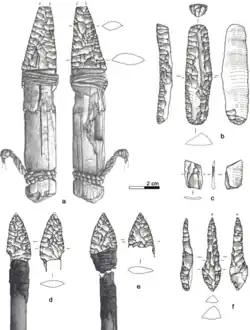 50. ^ Wierer, U., Arrighi, S., Bertola, S., Kaufmann, G., Baumgarten, B., Pedrotti, A., Pernter, P. and Pelegrin, J. (2018) "The Iceman's lithic toolkit: Raw material, technology, typology and use". PLOS ONE, 13(6): e0198292. doi:10.1371/journal.pone.0198292 The original caption in Wierer et al. read "The Iceman lithic assemblage. a) Dagger, b) Endscraper, c) Borer, d) Arrowhead 14, e) Arrowhead 12, f) Small flake." The text of Wierer et al.'s paper makes it clear that this a typo and the labels for the borer and small flake have been swapped. e.g.: "The 48.5 mm long artefact known as a borer has its maximum thickness at its maximum width (7.8 x 13.5 mm) (Fig 1F)" and "The smallest item contained in the belt poach is a small flake of 19 x 12.5 x 1.6 mm size (Fig 1C)".