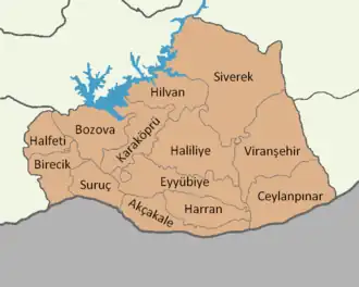 Şanlıurfa province is divided into 13 districts, listed below with their populations as at 31 December 2022 according to the official government estimates:[1]