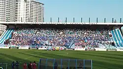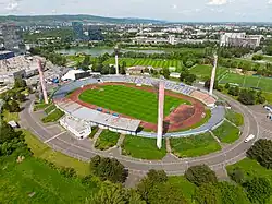 Tehelné pole, Slovan's previous stadium, was built during the first Slovak Republic, when Nazi Germany occupied Petržalka in 1938 and Bratislava lost almost all of its sporting facilities.[2] The construction lasted from 1939 to 1944 and the stadium became home ground for Slovan Bratislava. The stadium was officially opened in September 1940 with 25,000 places, and the first international match was played on 27 October 1940, with Slovan Bratislava playing against Hertha Berlin, ending in 2–2 tie. The old stadium underwent reconstruction in 1961, which added second tribune, boosting its capacity to 45,000 and modernising by adding score table, artificial light and revamping the field.[3] However, the stadium could hold up even 50,000 spectators, and just before breakup of Czechoslovakia, it was the largest one in use (Strahov Stadium in Prague had a capacity of 220,000 but was disused in the 1990s) and was the home ground for Czechoslovak national team.[4] The stadium was reconstructed once more in the 1990s to the "all-seater" stadium, reducing the capacity into 30,000.[4] The last match at the old Tehelné pole stadium was played in November 2009.