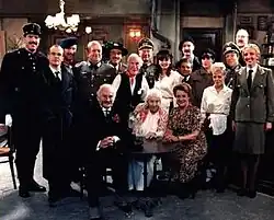 Croft and Lloyd devised the concept as a parody of BBC wartime drama Secret Army and initially launched the programme with a pilot on 30 December 1982.[4] The sitcom was eventually commissioned following the success of the pilot and ran for nine series between 7 September 1984 until its conclusion on 14 December 1992.[5] Both Lloyd and Croft wrote the scripts for the first six series, while the remainder were handled by Lloyd and Paul Adam.[6] Much like previous sitcoms created by Croft and Lloyd, the programme employed notable elements such as memorable catchphrases and ending credits, cultural clichés, physical humour and visual gags.[7] However, 'Allo 'Allo! differed from these other sitcoms by featuring overarching plot lines rather than simple stand-alone stories, as well as the device of having actors speaking English but with theatrical foreign accents to distinguish each character's nationality.[7]