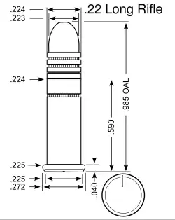.22 long rifle maximum C.I.P. cartridge dimensions. All sizes in millimetres (mm).[37]