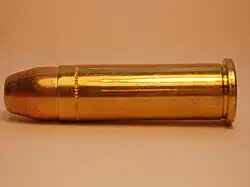 In 1956, the U.S. Air Force adopted the Cartridge, Caliber 38, Ball M41, a military variant of the .38 Special cartridge designed to conform to Hague Convention rules. The original 38 M41 ball cartridge used a 130-grain full-metal-jacketed bullet, and was loaded to an average pressure of only 13,000 pounds per square inch (90 MPa), giving a muzzle velocity of approximately 725 ft/s (221 m/s) from a 4-inch (100 mm) barrel.[17][18] This ammunition was intended to prolong the life of S&W M12 and Colt Aircrewman revolvers equipped with aluminum cylinders and frames, which were prone to stress fractures when fired with standard 38 Special ammunition. By 1961, a slightly revised M41 38 cartridge specification known as the Cartridge, Caliber 38 Ball, Special, M41 had been adopted for U.S. armed forces using 38 Special caliber handguns.[18] The new M41 Special cartridge used a 130-grain FMJ bullet loaded to a maximum allowable pressure of 16,000 pounds per square inch (110 MPa) for a velocity of approximately 950 ft/s (290 m/s) in a solid 6-inch (150 mm) test barrel, and about 750 ft/s (230 m/s) from a 4-inch (100 mm) revolver barrel.[19][20] The M41 ball cartridge was first used in .38 Special revolvers carried by USAF aircrew and Strategic Air Command security police, and by 1961 was in use by the U.S. Army for security police, dog handlers, and other personnel equipped with 38 Special caliber revolvers.[20] A variant of the standard M41 cartridge with a semi-pointed, unjacketed lead bullet was later adopted for CONUS (Continental United States) police and security personnel.[18] At the same time, .38 Special tracer cartridges were reintroduced by the US Navy, Marines, and Air Force to provide a means of emergency signaling by downed aircrew. Tracer cartridges in .38 Special caliber of different colors were issued, generally as part of a standard aircrew survival vest kit.