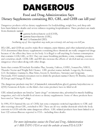 FDA warning against products containing GHB and its prodrugs, such as butane-1,4-diol.