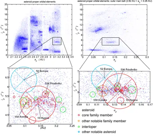 - ^ a b Carruba, V. (June 2013). "An analysis of the Hygiea asteroid family orbital region". Monthly Notices of the Royal Astronomical Society. 431 (4): 3557–3569. Bibcode:2013MNRAS.431.3557C. doi:10.1093/mnras/stt437. S2CID 122664149.