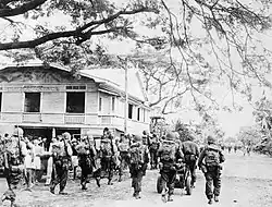 Assisted by a group of guerrillas, on the night of 21 February the divisional reconnaissance platoon made their way to the lake and collected ten canoes. Despite navigational difficulties, the platoon came ashore near Los Baños at 02:00 the following morning, and after securing the paratroopers' drop zone, concealed themselves in the jungle near the camp.[57] During the afternoon B Company of the 1st Battalion, 511th PIR was transferred to the airfield from which they would be deployed, while the rest of the battalion rendezvoused with the Amtrac convoy.[58] At 07:00 on the morning of 23 February, B Company took off in ten C-47s, arriving over their drop zone shortly afterwards.[58] As the first paratroopers landed, the reconnaissance platoon and the supporting guerilla fighters opened fire on the camp's defences, using bazooka rounds to penetrate the concrete pillboxes, and then entered the camp to engage its garrison. The paratroopers soon joined the battle, and by 07:30 the Japanese guards had been overcome and the internees were being rounded up and readied for evacuation.[59] At the lakeshore the 511th's other two companies had secured their beachhead, and the convoy of Amtracs reached the camp without incident. Priority during loading was given to the women, children and wounded; some of the able-bodied men walked alongside the Amtracs as they returned to the beach. The first evacuation convoy left the camp at approximately 10:00, with B Company, the reconnaissance platoon and the guerrillas remaining behind to provide a rearguard. By 11:30 all of the civilians had been evacuated, and at 13:00 the Amtrac convoy returned for the rearguard, with the last paratroopers leaving the beach at approximately 15:00.[60] Meanwhile, on Highway 1, the taskforce that had been deployed to protect the operation met heavy Japanese resistance and suffered several casualties, but was able to block Japanese forces that advanced on the camp, before retreating back to American lines.[61] The raid had been a complete success, liberating 2,147 civilians.[62]