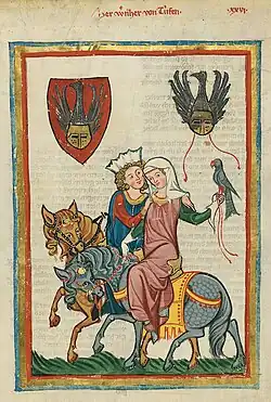 The possibilities of Giotto's art were developed further in this decade by his pupils Maso di Banco and Bernardo Daddi.[86] Significant of their works is Pope Sylvester Tames the Dragon, painted in 1340 by di Banco for the Church of Santa Croce in Florence.[86] An illustration by the artist Domenico Lenzi, the City Scene of 1340 from the Il Biadaiolo codex, shows just how much the Florentine artists were influenced by Giotto.[87]