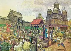 Accordingly, there were political divisions in the Russian states in this decade. The southern territories of Novgorod had been subjugated by Prince Algirdas of Lithuania in 1346, and Simeon of Moscow had failed to intervene.[40] The city was divided between competing boyar factions, and the lack of unity between Novgorod and her allies allowed for the success of Magnus' campaign of 1348.[41] Pskov officially broke away from Novgorod that year;[42] and Simeon was again delayed in helping against the Swedes, this time by business with his overlord, the Khan of the Golden Horde.[39] Orekhov was taken by the Swedes, although it was to fall in 1349.[39]