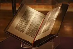 - ^ This Facsimile Page of Gutenberg's 42-line Bible (1453-1455) was Printed on the Gutenberg Press Loaned by the Gutenberg Museum of Mainz for "A Century of Progress International Exposition", Chicago, 1933, and Exhibited by the Cuneo Press, Inc. Gutenberg Press. 1933.