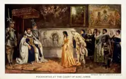 • Pocahontas and Tomocomo of the Powhatan Algonquian tribe, in the Virginia colony of America, meet King James I of England as his guests, at the Banqueting House at Whitehall.[1]