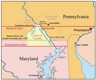 - March 16 – The establishment by Thomas Cresap of Wright's Ferry under the authority of the Province of Pennsylvania[2] becomes the basis for Cresap's War, a nine-year-long conflict also known as the Maryland-Pennsylvania boundary dispute; the conflict mainly centers in Lancaster County, Pennsylvania and York County, Pennsylvania on either bank of the Susquehanna River.