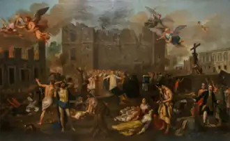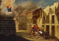 Allegory of the 1755 Earthquake, by João Glama Ströberle (who depicted himself standing on a pile of rubble on the lower-right corner). In the upper-left corner is an angel holding a fiery sword, personifying divine judgement.