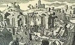 Executions in the aftermath of the Lisbon earthquake. At least 34 looters were hanged in the chaotic aftermath of the disaster. As a warning against looting, King Joseph I ordered gallows to be constructed in several parts of the city.[20]