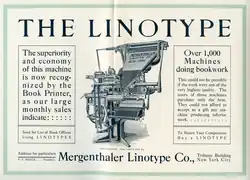 - 1884–1886: Ottmar Mergenthaler invents and refines the Linotype composing machine which mechanizes the process of typesetting for printing newspapers and books. This speeds up the composition of text for printing and revolutionizes communication of news and information. The Linotype allows for a daily newspaper, even in small towns.[42] The first Linotype was put into production at the New York Tribune on July 3, 1886 and was used at night to compose the “Tribune Book of Open-Air Sports” which was the first book created with Linotype type.[43]