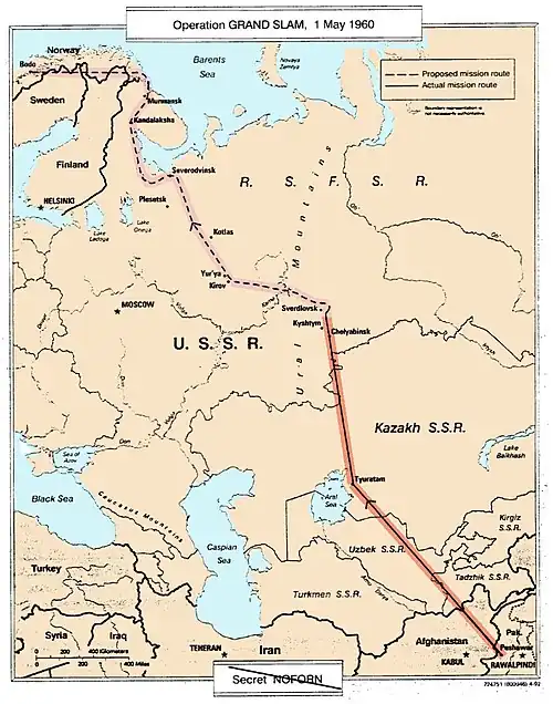 Dubbed "Grand Slam", the flight was to leave the base in Peshawar and overfly the Soviet Union. The photographic targets included the Soviet's ICBM launch pads: two at Baikonur Cosmodrome and four at Plesetsk Cosmodrome.[5] Another target was Chelyabinsk-65 (today, Mayak), an important industrial center of plutonium processing.[6] The flight would end with a landing at Bodø in Norway.