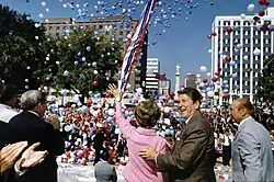 From top to bottom, left to right: the Iraqi invasion of Iran sparks the Iran–Iraq War; the 1980 eruption of Mount St. Helens devastates Washington and kills 57; John Lennon is shot and killed in New York City; the 1980 Summer Olympics in Moscow proceed amid the U.S. led 1980 Summer Olympics boycott; the Bologna massacre kills 85 in an Italian train-station bombing; the failed Operation Eagle Claw worsens the Iran hostage crisis; the Iranian Embassy siege in London ends after an SAS raid; the 1980 Irpinia earthquake in Italy kills thousands; and the 1980 United States presidential election sees Ronald Reagan defeat Jimmy Carter, ushering in the Reagan era.