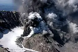 Seismic activity and gas emission steadily increased in early August, and on August 7 at 4:26 pm an ash cloud slowly expanded 8 mi (13 km) into the sky.[61] Small pyroclastic flows came through the northern breach and a weaker outpouring of ash rose from the crater. This continued until 10:32 pm, when a second large blast sent ash high into the air, proceeding due north.[61] A second dacite dome filled this vent a few days later.