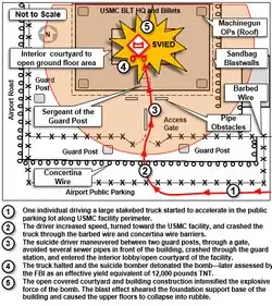 The explosive mechanism was a gas-enhanced device consisting of compressed butane in canisters employed with pentaerythritol tetranitrate (PETN) to create a fuel-air explosive.[6][7] The bomb was carried on a layer of concrete covered with a slab of marble to direct the blast upward.[44] Despite the lack of sophistication and wide availability of its component parts, a gas-enhanced device can be a lethal weapon. These devices were similar to fuel-air or thermobaric weapons, explaining the large blast and damage.[45] An after-action forensic investigation by the Federal Bureau of Investigation (FBI) determined that the bomb was so powerful that it probably would have brought down the building even if the sentries had managed to stop the truck between the gate and the building.[37]
