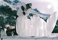 Mexican sculptor Abel Ramírez Águilar working on his gold medal piece in snow sculpture competition related to the Games