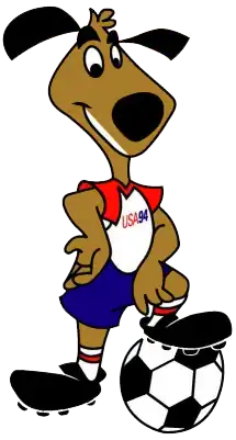 The official mascot of this World Cup was "Striker, the World Cup Pup", a dog wearing a red, white and blue soccer uniform with a ball.[65] Striker was designed by the Warner Bros. animation team.[66] A dog was picked as the mascot because dogs are a popular domestic pet in the United States.[66]