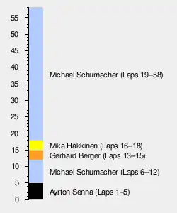 Schumacher took the lead on track on lap 12 when Berger ran wide, before relinquishing the race lead overall to Berger when he made his first pit stop, confirming that his pace both before and after the red flag was down to his running a three-stop strategy, therefore racing with a lighter car. Berger made a pit stop at the end of lap 15 for his first of two scheduled stops, before retiring a lap later with handling problems. Mika Häkkinen led his first ever laps of a Formula One World Championship race, before he made a pit stop at the conclusion of lap 18. Following the first series of pit stops, Schumacher resumed the race lead on aggregate, overtaking Nicola Larini on track at Tosa. Schumacher's extra pace as a result of his lighter fuel loads meant he was able to pull out enough of a gap to Häkkinen which enabled him to make an extra pit stop. Häkkinen's pace was very slow, allowing Larini to leapfrog him when drivers who planned to make two pit stops made their final pit stops.[30]