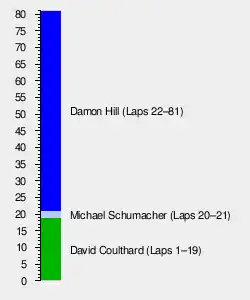 After the first round of pitstops, Schumacher and Alesi collided, with both retiring.[6] Schumacher's Benetton team-mate, Johnny Herbert took second place briefly before coming in for his first stop later than many of the other drivers, while surviving a potential accident in which he missed the pit entry and rejoined the track.[6] Berger was promoted to second, but his Ferrari encountered an engine problem, forcing him to retire. This promoted Frentzen to second, but he too retired due to a gearbox problem. With many of the front-runners out, Hill led at the front, even with a 22-second botched pit stop, with Herbert second. Jordan driver Eddie Irvine rounded out the top three, before retiring after losing all of his pneumatic pressure.[6] Herbert was still second, and looked set as a result to claim third place in the Drivers' Championship.[12] However, he was forced out of the race as his Benetton suffered a driveshaft failure.[6] Olivier Panis was now second in his Ligier a lap behind Hill, with Footwork driver Gianni Morbidelli third, two laps down. With a few laps remaining, Panis' Ligier was suffering an oil leak, and Hill lapped him for a second time on his way to victory.[6] Panis remained second, with Morbidelli third for his only career podium, and the first podium for the Footwork/Arrows team in six years.[6] Behind the top three, Mark Blundell was fourth in the sole McLaren, with Mika Salo fifth in the Tyrrell. Pedro Lamy had a mid-race spin, but recovered to take sixth in his Minardi – his only Formula One point, and Minardi's last until the 1999 European Grand Prix.[6] Only eight cars finished the race, with Pedro Diniz seventh place being Forti's best Formula One finish.[6] The eighth place for Pacific also equalled their best result since the 1995 German Grand Prix. The race was televised by Channel 9 in Australia and by the BBC in the UK.
