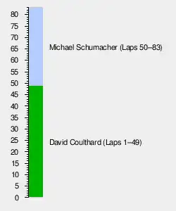 Schumacher made his second stop on lap 38, and came out of the pit lane just in front of third-placed Alesi, but over twenty seconds behind Coulthard. Schumacher immediately began setting fastest laps and began to close in on Coulthard once more.[1][26] Hill managed to move up to third, in front of Alesi, during their second pit stops on laps 38 and 39 respectively. The Ferrari of Alesi then dropped further back as teammate Berger passed him at the hairpin for fourth position on lap 45.[1] Coulthard made his second and final stop for new tyres on lap 49; exiting 14 seconds behind Schumacher, who continued to extend the margin between the two. Coulthard was unable to capitalise on the performance advantage offered by the new tyres after the stop due to lapped traffic getting in his way.[27][28] The German made his third and final pit stop on lap 60 with a 21-second advantage, exiting in front of Coulthard to lead the race.[5][26] Schumacher opened the gap to 15 seconds, and won the race after 83 laps to secure his eighth victory of the season in a time of 1:48:49.972s.[1] Schumacher was crowned the 1995 Drivers' Champion as Hill could not catch his points total with two races remaining.[3] He also became the youngest double Drivers' Champion in Formula One history.[26] Coulthard finished second in his Williams, 14 seconds behind Schumacher, with teammate Hill third. The Ferrari cars of Berger and Alesi were fourth and fifth respectively, but off the pace as Schumacher lapped them both in the closing stages. Berger suffered from a misfiring engine throughout the race.[28] Herbert took the final point in sixth place for Benetton, ahead of Frentzen, Panis and Blundell. Throughout the race, Barrichello and Magnussen engaged in a battle for tenth and eleventh positions, with Magnussen keeping Barrichello behind until lap 37 when the Brazilian managed to overtake him into the hairpin. Magnussen finished in tenth place, but Barrichello subsequently retired on lap 67 with an engine problem.[1] Magnussen's first race was described as "highly accomplished" by the year's Autocourse annual.[12] After his impressive qualifying performance, Irvine was heading for eighth place, but made an unscheduled pit stop on lap 72 and dropped to eleventh. The attrition rate was low, with 17 of the 24 starters finishing the race.[1]
