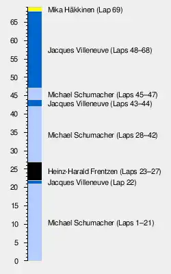 The race took place in the afternoon, starting at 14:00 CET (UTC+1), in dry and sunny weather. Villeneuve started the race in pole position, with Schumacher in second. Just a few moments before the start of the race, a blue liquid came out of Villeneuve's Williams; however, this did not influence his car during the race. Schumacher's getaway at the start was better than Villeneuve's and he had taken the lead by the time they reached the first corner. Schumacher led 40 of the first 47 laps of the race.[18] Frentzen also got a better start than Villeneuve and overtook him for second position. Under the orders of the Williams team, Frentzen let teammate Villeneuve past on lap eight.[19] On the 12th lap, Pedro Diniz's race ended early when he spun and stalled.[20] Schumacher made his first pit-stop on lap 22 and Villeneuve made his first stop the following lap. Both retained their positions. During the first round of pitstops the McLarens swapped places with Coulthard leading Häkkinen and Frentzen dropped to fifth position behind both of them.[19] The order of the leaders after the second round of pit stops on lap 43 and lap 44 remained the same but with Villeneuve closer to Schumacher.[19]
