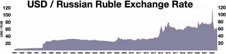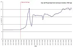 A graph shows the USD to Russian ruble exchange rate in the second half of 1998. In the weeks following 17 August, one US dollar went from being worth 6.43 rubles to being worth over 21 rubles.