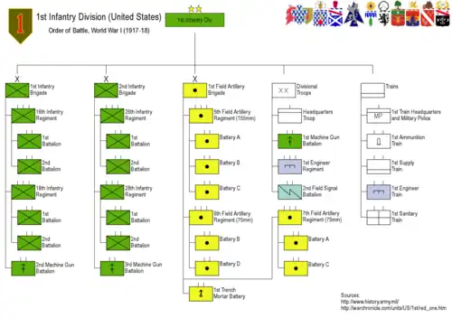 On 8 August 1917, the 1st Division adopted the "square" Table of Organization and Equipment (TO&E), which specified two organic infantry brigades of two infantry regiments each; one engineer regiment; one signal battalion; one machine gun battalion; one field artillery brigade of three field artillery regiments, and a complete division train. The total authorized strength of this new TO&E was 27,120 officers and enlisted men.