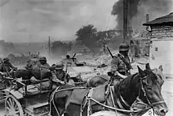 During the initial stages of the invasion of Poland, the LSSAH was attached to the 17. Infanterie-Division[31] and tasked with providing flank protection for the southern pincer. The regiment was involved in several battles against Polish cavalry brigades attempting to hit the flanks of the German advance. At Pabianice, a town near Łódź, the LSSAH fought elements of the Polish 28th Infantry Division and the Wołyńska Cavalry Brigade in close combat.[32] Throughout the campaign, the unit was notorious for burning villages.[33] In addition, members of the LSSAH committed atrocities in numerous Polish towns, including the murder of 50 Jews in Błonie and the massacre of 200 civilians, including children, who were machine gunned in Złoczew. Shootings also took place in Bolesławiec, Torzeniec, Goworowo, Mława, and Włocławek.[34]