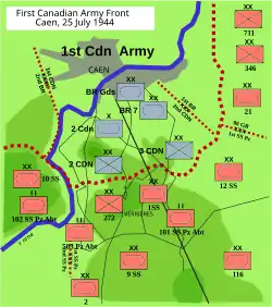 The British resumed their assault at around 13:00 on 19 July, having brought up reinforcements to continue the attack. They overran some of the forward German units and approached Bourguébus Ridge at 16:00. They came under fire from Panthers of the Leibstandarte, who had taken up positions on the ridge. Reinforcements of the 12th SS Panzer Division arrived at the right flank at around 15:00. The Canadians attacked next in the Battle of Verrières Ridge and Operation Spring (see map), where the LSSAH came up against a number of Allied divisions, including the Guards Armoured Division, 7th Armoured, 2nd and 3rd Canadian Divisions.[88]