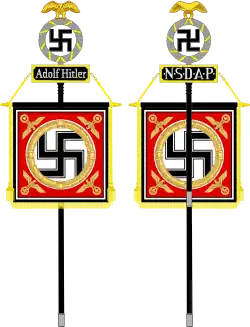 In May 1923, the unit was renamed Stoßtrupp (Shock Troop)–Hitler.[4] The unit numbered no more than 20 members at that time.[7] On 9 November 1923, the Stoßtrupp, along with the SA and several other Nazi paramilitary units, took part in the abortive Beer Hall Putsch in Munich. In the aftermath, Hitler was imprisoned and his party and all associated formations, including the Stoßtrupp, were disbanded.[8]
