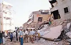 There were four earthquakes in 2001 that caused significant casualties. El Salvador was struck by two of them: a 7.6-magnitude earthquake on January 13 and a 6.6-magnitude earthquake on February 13, which resulted in the deaths of at least 944 and 315 people respectively.[53][54] The Bhuj earthquake, a 7.7-magnitude earthquake in Gujarat, India, on January 26 killed between 13,805 and 20,023 people, and destroyed nearly 340,000 buildings.[55][56] An 8.4-magnitude earthquake, then the strongest that had occurred globally since 1965, killed at least 77 people in Peru on June 23.[57] A 7.8-magnitude earthquake struck China with an epicenter near Kokoxili, close to the border between Qinghai and Xinjiang, on November 14, but it occurred in a sparsely populated mountainous region and there were no casualties.[58] Sicily saw the eruption of Mount Etna, beginning on July 17 and continuing into the next month.[9]: 185