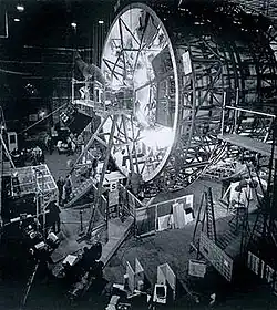 For spacecraft interior shots, ostensibly containing a giant centrifuge that produces artificial gravity, Kubrick had a 30-short-ton (27 t) rotating "ferris wheel" built by Vickers-Armstrong Engineering Group at a cost of $750,000 (equivalent to $6,800,000 in 2024[92]). The set was 38 feet (12 m) in diameter and 10 feet (3.0 m) wide.[93] Various scenes in the Discovery centrifuge were shot by securing set pieces within the wheel, then rotating it while the actor walked or ran in sync with its motion, keeping him at the bottom of the wheel as it turned. The camera could be fixed to the inside of the rotating wheel to show the actor walking completely "around" the set, or mounted in such a way that the wheel rotated independently of the stationary camera, as in the jogging scene where the camera appears to alternately precede and follow the running actor.[94]