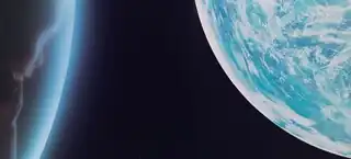 At Jupiter, Bowman finds a third, much larger monolith orbiting the planet. He leaves Discovery in an EVA pod to investigate. He is pulled into a vortex of coloured light and observes bizarre astronomical phenomena and strange landscapes of unusual colours as he passes by. Finally, he finds himself in a large neoclassical bedroom where he sees, then becomes, older versions of himself: first standing in the bedroom, middle-aged and still in his spacesuit, then dressed in leisure attire and eating dinner, and finally as an old man lying in bed. A monolith appears at the foot of the bed, and as Bowman reaches for it, he is transformed into a foetus enclosed in a transparent orb of light, which afterwards floats in space above the Earth.